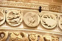 Timpanul este mărginit la exterior printr-o serie de vreo treizeci de medalioane circulare, în care alternează scene ale anotimpurilor și semne astrologice.