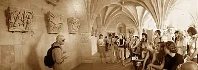Pe unul ditre capitelurile din această sală, Iuda este reprezentat în picioare pe capul demonului Lăcomiei reprezentat printr-o punga enormă pe care o ține în mână. El întinde un potir, care simbolizează sângele lui Cristos, către un reprezentant al Sinagogii, susținut și el de un demon, care este în fața sa. Această asociere de evrei și bani, simbolizată de o pungă bine aprovizionată, este un loc comun în arta medievală.[35]