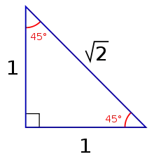 Imaginea unui triunghi dreptunghic particular având două catete egale (triunghi dreptunghic isoscel). Catetele sunt egale cu unitatea, iar ipotenuza este egală, conform teoremei lui Pitagora, cu 21/2=1,414...