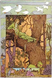 - Romancierul irlandez Padraic Colum a folosit o poveste similară în romanul său Fiul regelui Irlandei, în capitolul Povestea unică: regina își dorește o fiică cu ochi albaștri și păr blond și le urează neatentă fiilor ei „să meargă cu gâștele sălbatice”. De îndată ce fiica se naște, prinții se transformă în gâște sălbatice gri și zboară departe de castel.[55]