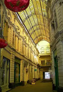 Cel mai vechi centru comercial din lume care reunește spațiile de vânzare ale mai multor comercianți sub un singur acoperiș, este Marele Bazar din Ispahan, Iran. Bazarul a fost construit în secolul al X-lea în perioada Selgiucidă. Orașul Ispahan a cunoscut o nouă înflorire în perioada Safavidă când Shah Abbas a ales orașul drept capitală. Bazarul este stradă acoperită de aproximativ 2 km. lungime, care unește Moscheea de Vineri și vechiul "maydan" cu noul maidan al lui Shah Abbas. Aici era noul centru al orașului unde piața având dimensiunile de 510 pe 158 metri era numită Maidan-i Naqș-i Pasajul Macca 2.jpgJahan (Piața Creației Lumii). Concepția pieții unea cele patru aspecte principale ale politicii Safavide într-o unică diagramă spațială: credința - reprezentată de Moscheea Șahului, comemorarea strămoșilor - reprezentată de Moscheea Șeik Lutfallah, adminsitrația imperiului - reprezentată de Palatul Imperial și comerțul reprezentat de bazarul imperial. Portalul de intrare de la Maydan-i-Shah, construit în 1619 de Shah Abbas este similar cu portalul de intrare în moscheea din fața opusă a pieții. Portalul permite accesul la Bazaar Qaisarieh (bazarul imperial), o extindere a marelui bazar, unde era amplasată și monetăria. Bazarul este luminat prin goluri circulare lăsate deschise în bolta de cărămidă, goluri care creează și un mod de ventilație a bazarului, permițând formarea unor curenți de aer datorită cărora in interiorul bazarului este tot timpul răcoare, chiar în perioadele foarte călduroase. Pe aleile laterale exsită caravanseraiuri, moschei și ateliere meșteșugărești. Până acum câteva decenii, tot pe aleile laterale se mai măcinau cereale, roțile de moară fiind puse în mișcare de cămile. [1]