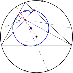 Centrul celor nouă puncte N se află pe dreapta lui Euler a triunghiului, la punctul de mijloc dintre ortocentrul H și centrul cercului circumscris O al triunghiului respectiv. Centroidul(d) G se află, de asemenea, pe aceeași dreaptă, la 2/3 din distanța de la ortocentru la centrul cercului circumscris,[2][3] deci