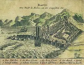 În timpul dinastiei Sasanide, cetatea din centrul orașului Baku, Abșeron, făcea parte din provincia specială imperială Șirvan. După ocuparea teritoriului de către arabi, împreună cu Șamahî, Derbent și alte orașe, conducătorii regiunii au început să fie numiți Șirvanșahi(d). Al-Balazuri(d), Al-Masudi și alți câțiva istorici arabi au relatat că Hosrov Anușirvan s-a ocupat de administrarea regiunii; el a dat pentru prima oară titlul de șirvanșahi conducătorilor din regiunea Șirvan. Există doar informații succinte despre secolele al VII-lea-al X-lea despre Baku. Se știe că orașul a fost atacat de turci(d) și de ruși dinspre nord. În 914, rutenii au atacat(d) portul Baku. Potrivit lui al-Masudi, ei erau interesați de teritoriul bogat în petrol de la Baku. Neavând o flotă militară la Marea Caspică Șirvanșahul Ali ibn Heysam(d) a trebuit să recurgă la nave comerciale pentru a-și transporta soldații. Potrivit lui al-Masudi, ca rezultat al acestui atac al rușilor, mii de musulmani au murit și s-au înecat în mare. Atacurile către coastele Mării Caspice la Baku și Abșeron s-au repetat de mai multe ori în perioadele ulterioare.[7]
