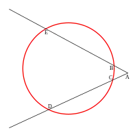 - Dacă o tangentă de la un punct exterior D intersectează cercul în C și o secantă din același punct D intersectează cercul în G și E, atunci DC2 = DG * DE.