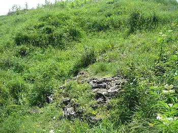 Vedere de pe măgură (din afara zidului de sud-est) către ruinele turnului de sud