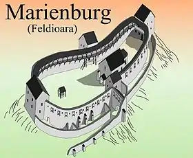 Una din cetățile construite de teutoni, după plecarea lor avea numele de "Sanctae Mariae" și era construită pe colină la Feldioara, fiind înconjurată pe trei laturi de râul Homorod. Experiența de constructori a teutonilor acumulată în Țara Sfântă și în Asia Mică a adus pe meleagurile transilvănene tehnici și soluții de construcție întâlnite la marile castele cruciate de la Tyr, Crac des Chevaliers și Ascalon. Din vechea cetate a teutonilor se mai păstrează astăzi numai un rest dintr-un zid de piatră în partea de nord-vest. Acest zid s-a dovedit din punct de vedere a tehnicii de construcție total diferit de restul ansamblului. La baza lui au fost așezați bolovani mari deasupra cărora s-a ridicat un zid din bolovani legați cu mortar de bună calitate. Conform datelor topometrice se pare că cetatea a fost înconjurată de o nouă incintă, a doua, în interiorul căreia exista o capelă, o "Casă a cavalerului" și o bolniță, casa cavalerului jucând rolul de refectoriu, la parter, sală de mese, magazie, la etaj, și dormitor la ultimul etaj. Cu ocazia incursiunilor făcute de tătari în anul 1241, atât capela cât și celelalte clădiri au fost distruse. Pe ruinele fortificației, cistercienii care controlau localitatea printr-un ordin dat de Bela al IV-lea, au construit actuala biserică. Capela romanică a cavalerilor teutoni, probabil, este încorporată în corul gotic și ruinele Casei Cavalerului care fac parte din temeliile corpului bazilical.[7]