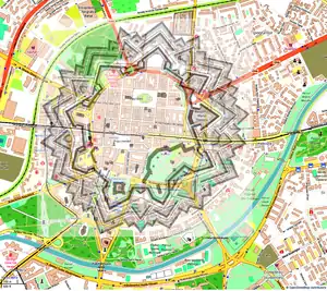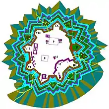 Planul cetății otomane Timișoara, pe harta lui Perrette (v. mai jos). Notațiile sunt cele folosite de Opriș.[100]
