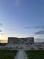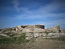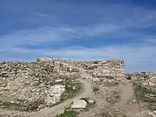În apropierea ruinelor cetății, la circa 120 de metri mai la nord se pot observa ruinlele unei contrucții de formă basilicală (cu dimensiunile de 38x18 metri), unde se mai pot vedea rămășițe de pietre paralelipipedice de dimensiuni mari ce se găsesc parțial și în șanțul fortificației pentagonale a cetății. Plasarea acestei forme atât de aproape de zidurile fortificației confirmă faptul că clădirea era deja în ruină atunci când șanțul a fost construit, altfel ar fi reprezentat o mare vulnerabilitate. O cercetare arheologică mai amănunțită a acestei structuri (posibil creștine) ar putea ajuta la rezolvarea problemei datării turnului circular.[37]