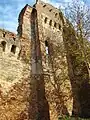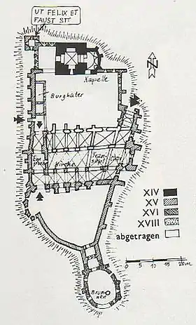 Din structura inițială a edificiului de cult se păstrează azi doar zidurile exterioare și zidul din spre nord. Cu toate că structura este impresionantă, din cauza planului neobișnuit precum și nivelul ridicat al corului care avea prevăzut pe dedesubt un tunel ce iese către turnul-poartă, indiciile despre finalitatea construcției ca formă și estetică a ei, ramân necunoscute.