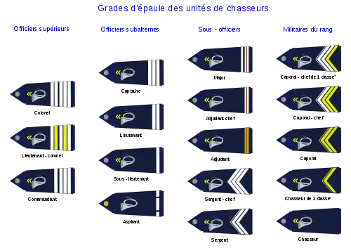 Notă: Gradele de Brigadier și Maréchal des logis nu sunt utilizate în corpul vânătorilor alpini, deoarece el aparține infanteriei.