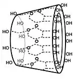 Ciclodextrinele sunt compuse din 5 sau mai multe unități de α-D-glucopiranozidă, legate 1->4, în mod analog moleculei de amiloză (component al amidonului). Cea mai mare ciclodextrină conține 32 unități 1,4-anhidroglucopiranozidice. Cele mai comune ciclodextrine conțin între 6 și 8 unități de glucoză în ciclu, ceea ce le imprimă o formă de con (asemănătoare unui toroid). Acestea sunt:[2]