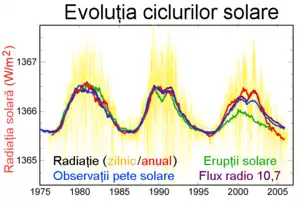 Ciclul solar are o durată medie de 11,2 ani, însă se cunosc și cicluri solare cu durate între 8 și 15 ani. Se presupune că un ciclu solar este determinat de câmpul magnetic al Soarelui, care se inversează o dată la 11 ani, un ciclu magnetic complet durând de fapt 22 de ani. Activitatea solară este caracterizată prin numărul de pete solare, numărul de erupții solare și radiația solară. Cel mai bun indice este considerat cel al radiației de 2,8 GHz, adică al radiației cu lungimea de undă de 10,7 cm.