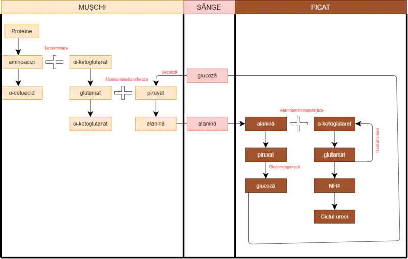 Deoarece mușchiul scheletic nu este capabil să utilizeze ciclul ureei pentru a elimina în siguranță ionii de amoniu generați de catabolismul aminoacizilor, trebuie să dispună de ei într-un mod diferit. Pentru a face acest lucru, amoniul este combinat cu α-cetoglutaratul liber printr-o reacție de transaminare, producând glutamat și un α-ceto acid. Alaninaminotrasferaza (ALT), cunoscută și sub numele de transaminaza glutamică-piruvică (GPT), transformă apoi glutamatul înapoi în α-cetoglutarat, de această dată transferând gruparea de amoniu la piruvatul rezultat din glicoliză, formând alanina liberă. Alanina acționează apoi ca o navetă - părăsește celula, intră în fluxul sanguin și călătorește către hepatocite, unde, în esență, acest întreg proces este inversat. Astfel, alanina suferă o reacție de transaminare cu α-cetoglutaratul liber, rezultând glutamatul, care este apoi dezaminat pentru a forma piruvat și, în cele din urmă, ionul de amoniu liber. Hepatocitele sunt capabile să metabolizeze amoniul toxic prin ciclul ureei, eliminându-l astfel în siguranță. Ultima parte a ciclului constă în furnizarea celulelor musculare scheletice lipsite de energie cu glucoză. Piruvatul format din dezaminarea glutamatului în hepatocite trece prin procesul de gluconeogeneză pentru a forma glucoză, care poate pătrunde apoi în fluxul sanguin, ajungând la țesutul muscular scheletic, unde este folosită pentru generarea de energie. [6]
