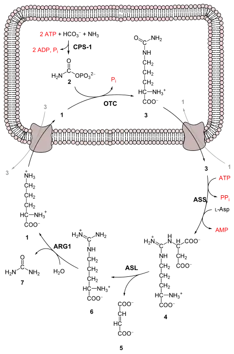 | 1 | NH3 + HCO3− + 2ATP | carbamoil-fosfat + 2ADP + Pi | CPS1 | mitocondrie |