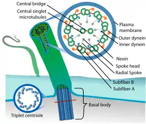 Cilii eucariotelor au membrană și perechi de microtubuli aranjate astfel: doi microtubului se află în centru, iar periferic se află nouă grupe a câte doi microtubului fiecare. Fiecare cil se ancorează în celulă printr-un corpuscul bazal cu aceeași structură ca a centriolilor din care derivă. Mișcarea cililor și flagelilor este controlată de un granul sau corpuscul bazal.