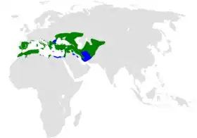| Arealul speciei. Verde – sedentar sau oaspete de vară. Albastru - Cartierele de iernare | |