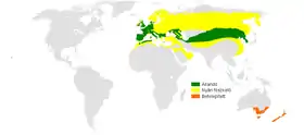 | Arealul speciei. Galben - oaspete de vară, cuibărește. Verde - sedentar, prezent tot timpul anului. Roșu - introdusă | |