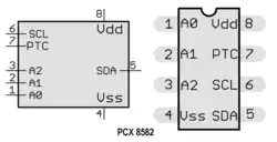 - Prin utilizarea unui cod intern de stocare redundant, circuitul de memorie PCF8582 este tolerant la erorile pe un singur bit. Această caracteristică importantă crește mult fiabilitatea în comparație cu alte memorii similare de tip EEPROM.
