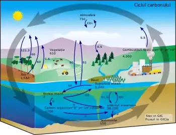 În figura alăturată sunt prezentate fluxurile de carbon între atmosferă și biosferă, hidrosferă și litosferă.