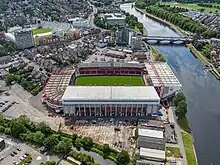 Vedere aeriană a proximității dintre City Ground (jos) și Meadow Lane