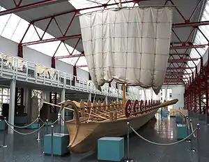 Reconstrucţia navei fluviale romane (în latină navis lusoria) a flotilei Rinului (Classis Germanica). Ea se bazează pe descoperirea remarcabilă a rămâșițelor a cinci nave romane de la Mainz la începutul anilor 1980. Nava de mai sus, notată Mainz de tip A, a fost concepută ca o navă de intervenție rapidă, cu forma lungi, înguste și keel superficial. Ar fi fost vâslită de către trupele înșăși (32 rame, 16 pe fiecare parte). Scuturile montate lateral proteja vâslașii de proiectelele venite dinspre malurile râului. Secolul al IV-lea. Museum für Antike Schifffahrt, Mainz, Germany