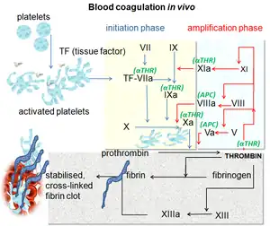 Coagularea are loc, din punct de vedere biochimic, în momentul precipitării fibrinogenului, care se transformă în fibrină, o substanță insolubilă care formează o rețea. Până în acest punct, au loc diverse reacții enzimatice în cascadă, fiecare având un rol important pentru formarea în final a rețelei de fibrină. Un rol important îl joacă, printre altele, și trombina, rețeaua formându-se în prezența ei. [2]
