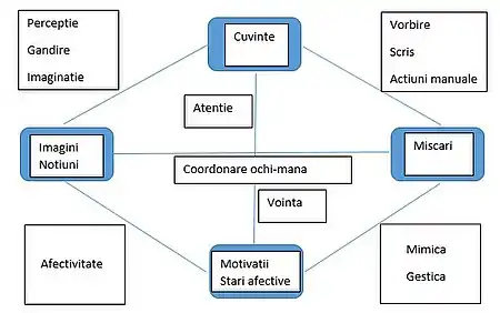 Coordonarea mișcărilor, atenția, voința și memoria intervin în tot ceea ce oamenii gândesc, simt și fac. Coordonarea ochi-mană (sau ureche-gură etc.) este controlul mișcărilor prin imaginile pe care oamenii le percep. Atenția este focalizarea activității cu ajutorul cuvintelor, pe bază de motivații. Voința este controlul activității tot prin comenzi verbale și pe baza motivațiilor. Comenzile verbale țin de limbajul intern (vorbirea cu sine însuși: "Vreau să fac/să nu fac asta").