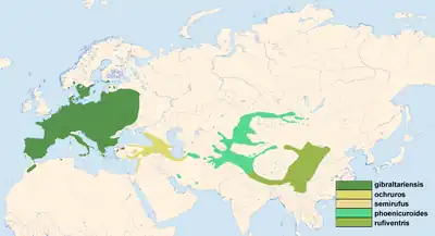 Cramp (1988)[23] recunoaște două grupuri principale de subspecii. Grupul gibraltariensis cu abdomenul întunecat, cu 2 subspecii P. o. gibraltariensis și P. o. aterrimus, care cuibăresc în Europa și Africa de Nord, la est până în vestul Turciei, și grupul phoenicuroides cu abdomenul roșu cu 4 subspecii P. o. phoenicuroides, P. o. rufiventris, P. o. semirufus și P. o. xerophiles care cuibăresc în Asia Centrală, la vest până în Turkmenia, nord-estul Iranului și Levant. Subspecia nominată P. o. ochruros cuibărește în vestul și centrul Turciei, Caucaz și nordul Iranului și are caractere intermediare între aceste două grupuri.[24]