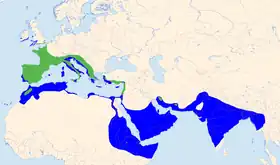 - Iernează sporadic în sudul Angliei, Belgia, Germania și Elveția și mai frecvent în regiunea mediteraneană din centrul și vestul Franței până în Spania (inclusiv Insulele Baleare), Portugalia, Corsica, Sardinia, Sicilia, Italia (la nord până în Alpi), în mai la sud din Balcani, Bulgaria, Grecia, Cipru, vestul și sudul Turciei (inclusiv insulele egeene) până în Liban, Siria, Israel și Iordania. În Insulele Canare apare regulat, dar rar în pasaj și este oaspete de iarnă în toate insulele principale (cu excepția insulei La Gomera) și mai ales în insulele estice. În nordul Africii iernează în nordul și vest-centrul Marocului, nordul Algeriei (uneori în centrul și sudul Algeriei), Tunisia (la sud până la oazele de la marginea Saharei), nordul Libiei și nordul Egiptului (în principal pe coasta nordică, în Delta Nilului și mai la sud de-a lungul Nilului până în Luxor și în tot Sinaiul, uneori în oazele din deșerturile din vest și est), mai la sud până în centrul și estul Sudanului (până la coasta Mării Roșii) și în oazele din centrul Algeriei și Libiei, coasta Mauritaniei de și mai la sud până în Sahel (mai ales în jurul așezărilor omenești).[8]