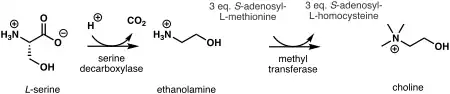 La plante, prima etapă a biosintezei de novo a colinei pornește cu decarboxilarea serinei la etanolamină, reacție catalizată de serin-decarboxilază.[7] Sinteza colinei de la etanolamină poate avea loc în trei etape paralele ce presupun procese de N-metilare consecutive, catalizate de metil-transferaze, la nivelul grupei amino,[8] fosfat,[9] sau fosfatidil.[10] Sursa de grupa metil este S-adenozilmetionina, iar S-adenozilhomocisteina este generată ca produs secundar al procesului biochimic.[11]