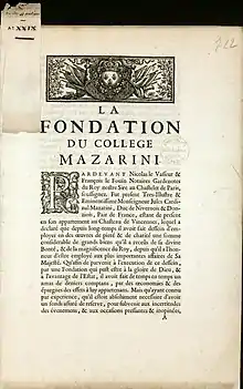 Collège des Quatre-Nations (cunoscut anterior sub numele de Collège Mazarin): fundație și statut. Tipărit, secolul al XVII-lea (Bibliothèque de la Sorbonne, NuBIS)