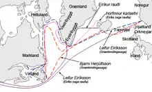 Existența călătoriilor vikingilor spre Groenlanda și Canada sunt susținute de dovezi istorice și arheologice.[9] O colonie popoarelor nordice în Groenlanda a fost înființată la sfârșitul secolului al X-lea și a rezistat până pe la mijlocul secolului al XV-lea. Colonia a avut un tribunal și un parlament care își aveau sediul în Brattahlíð și un episcop cu sediul la Garðar.[10] Ruinele unei așezări scandinave de la L'Anse aux Meadows de pe Insula Terranova, Canada, au fost descoperite în 1960 și au fost datate în jurul anului 1000 (datarea cu carbon a estimat perioada 990–1050).[11] L'Anse aux Meadows este singul sit acceptat de întreaga lume științifică ca dovadă a contactelor transoceanice precolumbiene. Acest sit a fost inclus pe lista Locurilor din Patrimoniul Mondial al UNESCO în 1978.[12] L'Anse aux Meadows ar putea să fie legendara colonie Vinland fondată de Leif Eriksson cam în aceeași perioadă.[13]