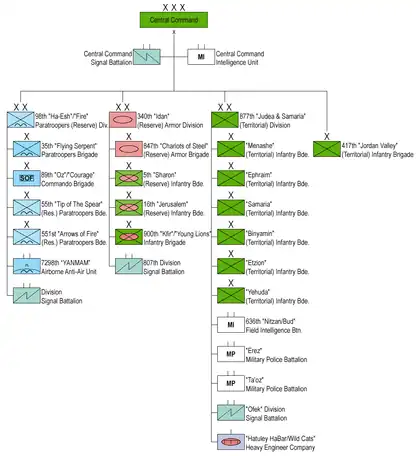 Este responsabil pentru unitățile și brigăzile din Cisiordania (sub Diviziunea Cisiordania), Ierusalim, Sharon, Gush Dan și Shephelah.