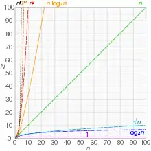| timp cvasiliniar | O(n log n) | n log n, log n! | Cea mai rapidă sortare prin comparație(d) posibilă; transformata Fourier rapidă(d). | |