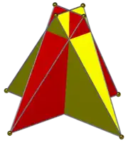 - O fațetare a unui trapezoedru trigonal creează un compus din două piramide triunghiulare drepte cu un nucleu în formă de antiprismă triunghiulară. Acesta este primul din setul de compuși de două piramide poziționate una față de cealalală simetric față de centru.