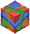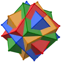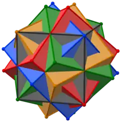Cele opt vârfuri de pe axele de simetrie cu trei poziții pot fi văzute ca vârfurile unui al cincilea cub de aceeași dimensiune.[3] În imaginile de mai jos cele patru cuburi inițiale sunt cele colorate, iar cel nou este cel negru. Fiecare cub colorat are două vârfuri opuse pe o axă de simetrie cu trei poziții, care sunt comune cu ale cubului negru. (În imagine sunt vizibile ambele vârfuri din cele trei poziții ale cubului verde.) Cele șase vârfuri rămase ale fiecărui cub colorat corespund fețelor cubului negru. Acest compus are aceleași proprietăți cu compusul de cinci cuburi (legat de dodecaedrul regulat), în care poate fi transformat prin rotirea cuburilor colorate pe axele lor cu trei poziții.