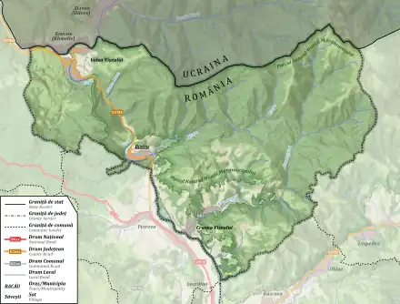 Comuna are o suprafață de 132,39 km2 și este în mare parte muntoasă și împădurită. Se învecinează cu Ucraina la nord, comuna Repedea la est, comuna Ruscova la sud-est, comuna Petrova la sud-vest și comuna Rona de Sus la vest.