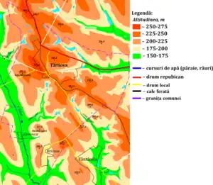 În acest context, relieful comunei reprezintă un podiș fragmentat de văi și râpi ale cursurilor de apă. Înălțimea maximă absolută de pe teritoriul comunei este dealul Tîrnova, la sud-vest de localitatea omonimă cu altitudinea de 264,6 m, al doilea deal după înălțime, de 260,3 m, se află la extremitatea nordică a comunei. În apropiere de satul Tîrnova se înalță vârful Fața Răutului - 231,1 m; d. Lebedi de 253,3 m și un deal anonim de 210,4 m. Cel mai înalt vârf din apropierea satului Elenovca este dealul Râpa Carei de 214,1 m, iar de lângă satul Briceva este un deal localizat la est de sat de 208,5 m. Cel mai jos punct în perimetrul comunei se află în lunca Răutului și reprezintă 140,0 m deasupra nivelului mării. Altitudinea medie a satului Tîrnova este de 227 m, a satului Briceva de 189 m și a Elenovcăi - 155 m. Dezmembrarea pe orizontală a reliefului constituie 1,81 km/km2. În preajma satelor Elenovca și Briceva dezmembrarea verticală este mai intensă, înregistrându-se 2,01 km/km2. Dezmembrarea medie pe verticală a reliefului constituie 124,6 m, cea mai mare dezmembrare s-a identificat în preajma satului Briceva fiind egală cu 101,6 m. În apropiere de Tîrnova dezmembrarea pe verticală este de - 94,6 m și în Elenovca - 74,1 m.