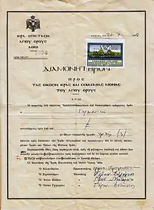 Toate persoanele care duc o viață monahală în comunitatea monahală primesc cetățenia greacă la admiterea ca novici sau călugări. Mirenii pot vizita comunitatea monahală, dar au nevoie de un permis special cunoscut sub numele de diamonitirion (διαμονητήριον).