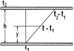 Se consideră un fluid în reapaus, aflat între două plăci plane paralele situate la distanța h, suficient de mică pentru a nu exista curenți de convecție termică. Placa inferioară are temperatura t1, iar cea superioară t2. Experimental se constată că fluidul aflat în contact cu o placă are aceeași temperatură cu placa. După un interval de timp suficient de mare, există o repartiție liniară a temperaturii fluidului aflat între cele două plăci, deoarece căldura se transmite de la placa superioară mai caldă, la cea inferioară mai rece.
