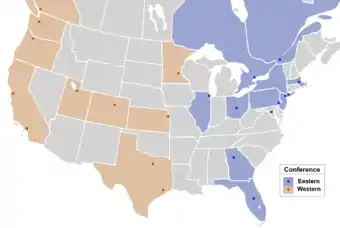 Localizarea echipelor din MLS; Echipele din Conferința de Vest sunt marcate cu maro
