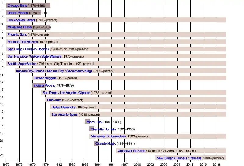 | Chicago Bulls | Chicago, Illinois | 1970 | Divizia de Vest | 1979 | Conferința de Est | Conferința de Est |