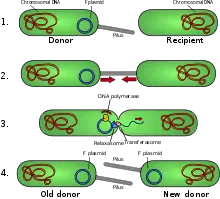 Conjugarea este o modalitate de transfer de material genetic de la o celulă donoare, la una receptoare, prin intermediul unei legături celulare directe. Procesul este condiționat de existența, în celula donoare, a unei plasmide cu funcție de conjugon (transferon sau plasmidă conjugativă), care trebuie sa codifice structurile necesare realizării contactului celular, iar pe de altă parte, sa pregătească transferul în celula receptoare, adică sa fie o plasmida mobilizabila. Absența uneia sau a ambelor funcții, semnifică existența plasmidelor neconjugative și/sau nemobilizabile.