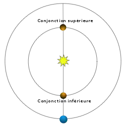 - conjuncție superioară, când Soarele se găsește aproximativ între planeta respectivă și Pământ;