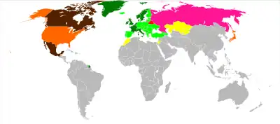 - Belgia, Danemarca, Franța, Grecia, Irlanda, Italia, Luxemburg, Marea Britanie, Norvegia, Olanda, Suedia și Turcia (1949)
