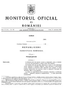 Prima pagină a Consituției publicate în 2003 în Monitorul Oficial. Stema României a fost adoptată prin lege separată. [1]