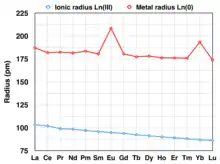 În cazul elementelor lantanide, razele ionice și atomice scad odată cu creșterea numărului de ordine Z, fenomen cunoscut sub denumirea de contracția lantanidelor. Fenomenul se datorează atragerii mai intense dintre electronii de valență situați într-un orbital interior 4f, precum și ecranării electronilor f de către învelișul electronic exterior. Fenomenul a fost observat de către geochimistul norvegian Victor M. Goldschmidt și raportat în „Geochemische Verteilungsgesetze der Elemente”.[1]