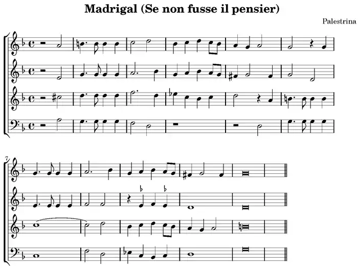 Contrapunct într-un madrigal de Palestrina. Mi Bemol este folosit în măsurile 4 și 9 pentru evitarea tritonului cu Si Bemol.