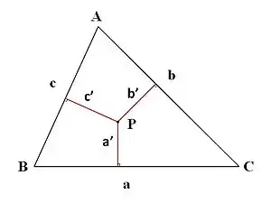Dacă punctul P se află de exemplu pe latura BC a triunghiului, atunci perpendiculara din P va fi nulă, deci α = 0. Similar pentru puncte aflate pe AC β = 0, iar pentru cele de pe AB γ = 0.