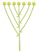 Este format dintr-o axă pe care se prind flori inegal pedunculate, cele inferioare având pedunculi mai lungi și ajungând astfel la același nivel cu cele superioare. Înflorirea se produce de la margine spre centru.